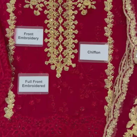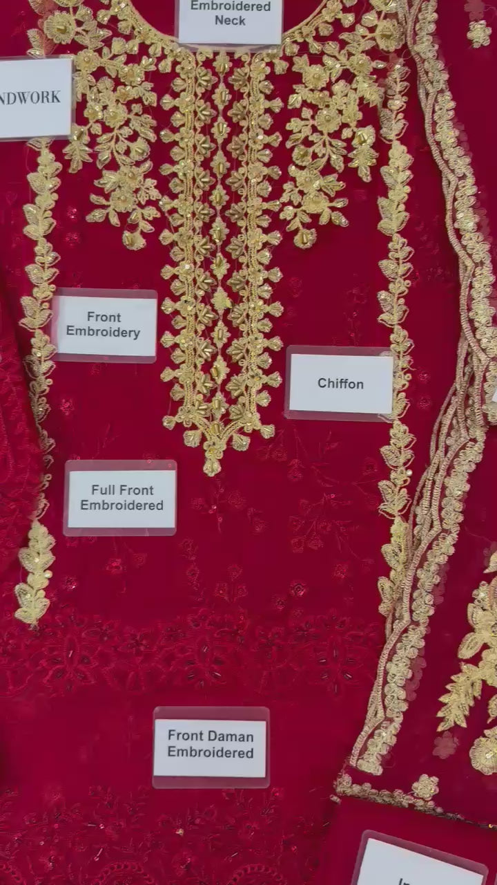 Make a bold statement with this Royal Crimson chiffon suit from Veloria Fabrics, designed for festive elegance and timeless sophistication. With intricate embroidery, adda work, and coordinated daman patches, this outfit is perfect for weddings, formal gatherings, and celebratory evenings.