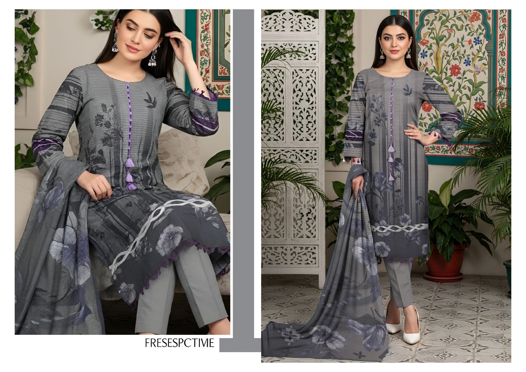 ✨ Embrace soft sophistication with our ninth Banadora design – the Digital Print Dhanak 3PC Suit (SKU: DHBD-9). This elegant ensemble features a straight-cut dhanak shirt in muted grey tones, adorned with vertical stripes and delicate floral motifs in shades of purple and beige. The front placket is enhanced with decorative tassels, adding a playful yet refined detail. Full sleeves and a round neckline complete the look with classic charm. Paired with light grey straight-cut trousers and a printed dhanak dupatta that mirrors the shirt’s floral design, this outfit offers a cohesive and graceful winter statement. Crafted from soft dhanak fabric, it ensures warmth and comfort while maintaining a flattering silhouette. The unstitched format allows for personalized tailoring, making DHBD-9 ideal for seasonal gatherings, cultural events, or everyday elegance.