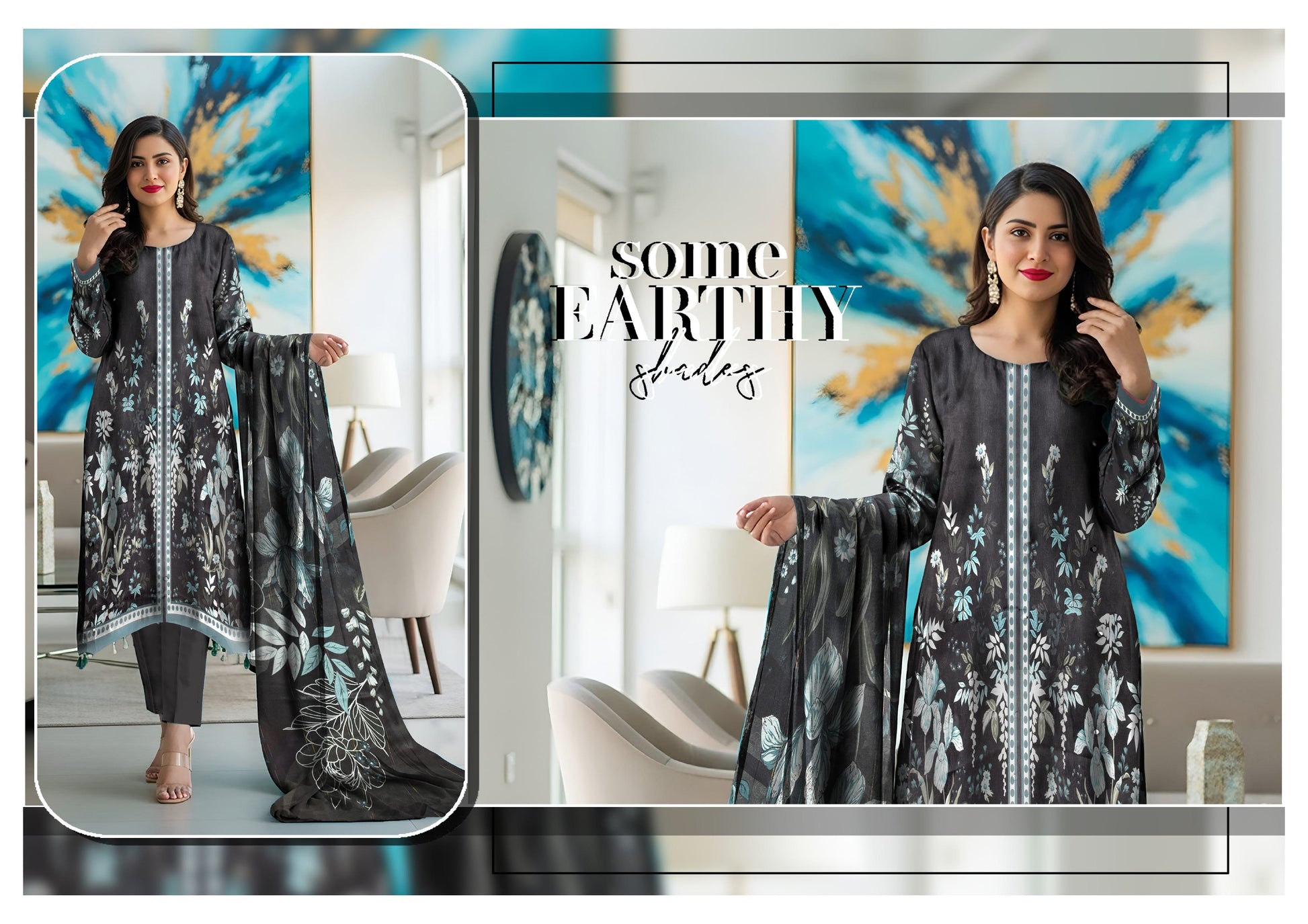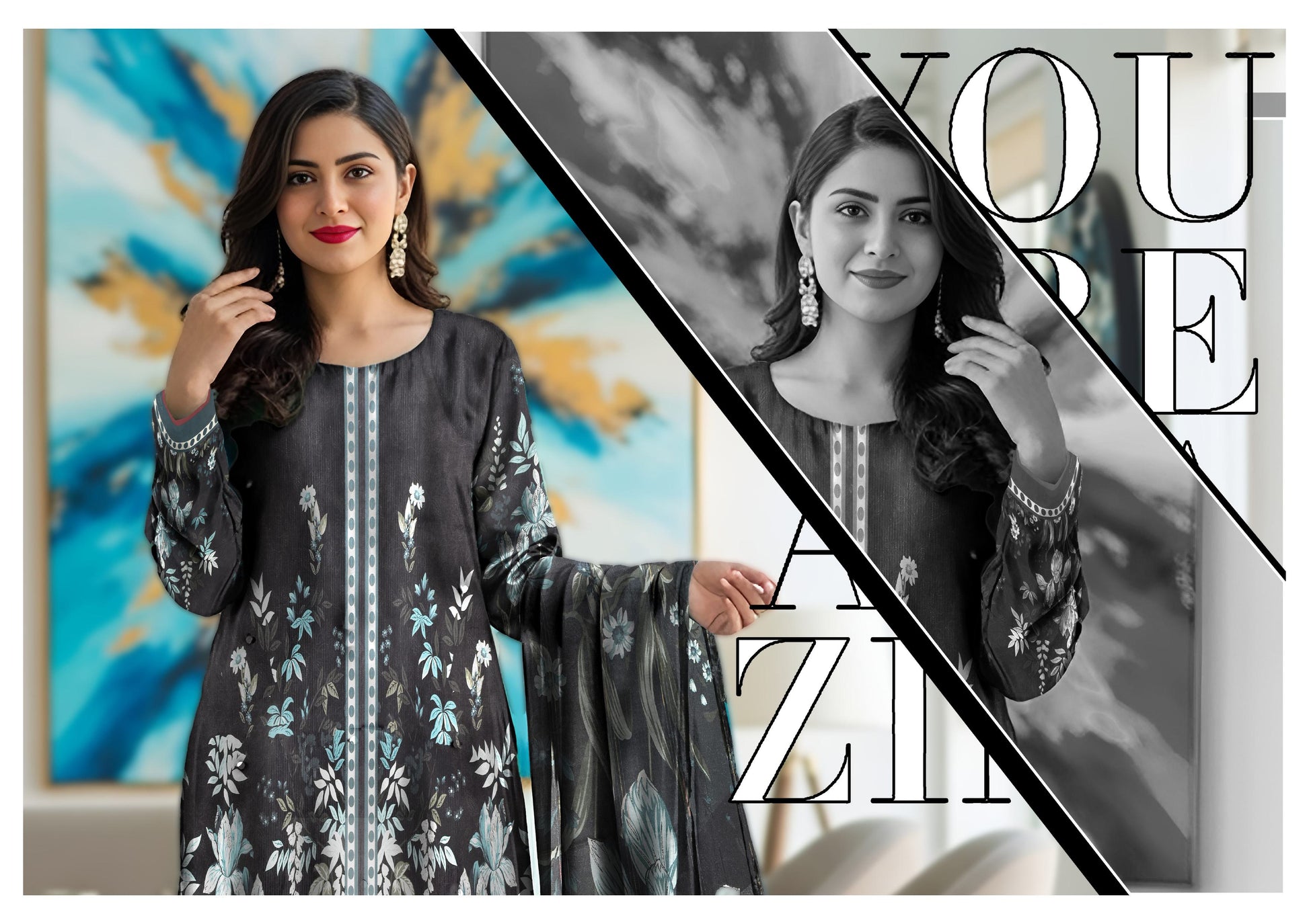 Embrace grounded elegance with Some Earthy Shades, a refined statement from the Staple Banadora Bold collection. This 3PC unstitched suit is crafted from premium winter linen in a rich black base, elevated by intricate white floral and geometric digital prints. A vertical embroidered stripe adds structure to the shirt, while the full-length sleeves are finished with matching embroidered cuffs for a cohesive finish. The ensemble is paired with a fancy Monal dupatta featuring bold white botanical motifs that echo the shirt’s design. Ideal for winter wear, this suit blends earthy tones with modern South Asian sophistication.