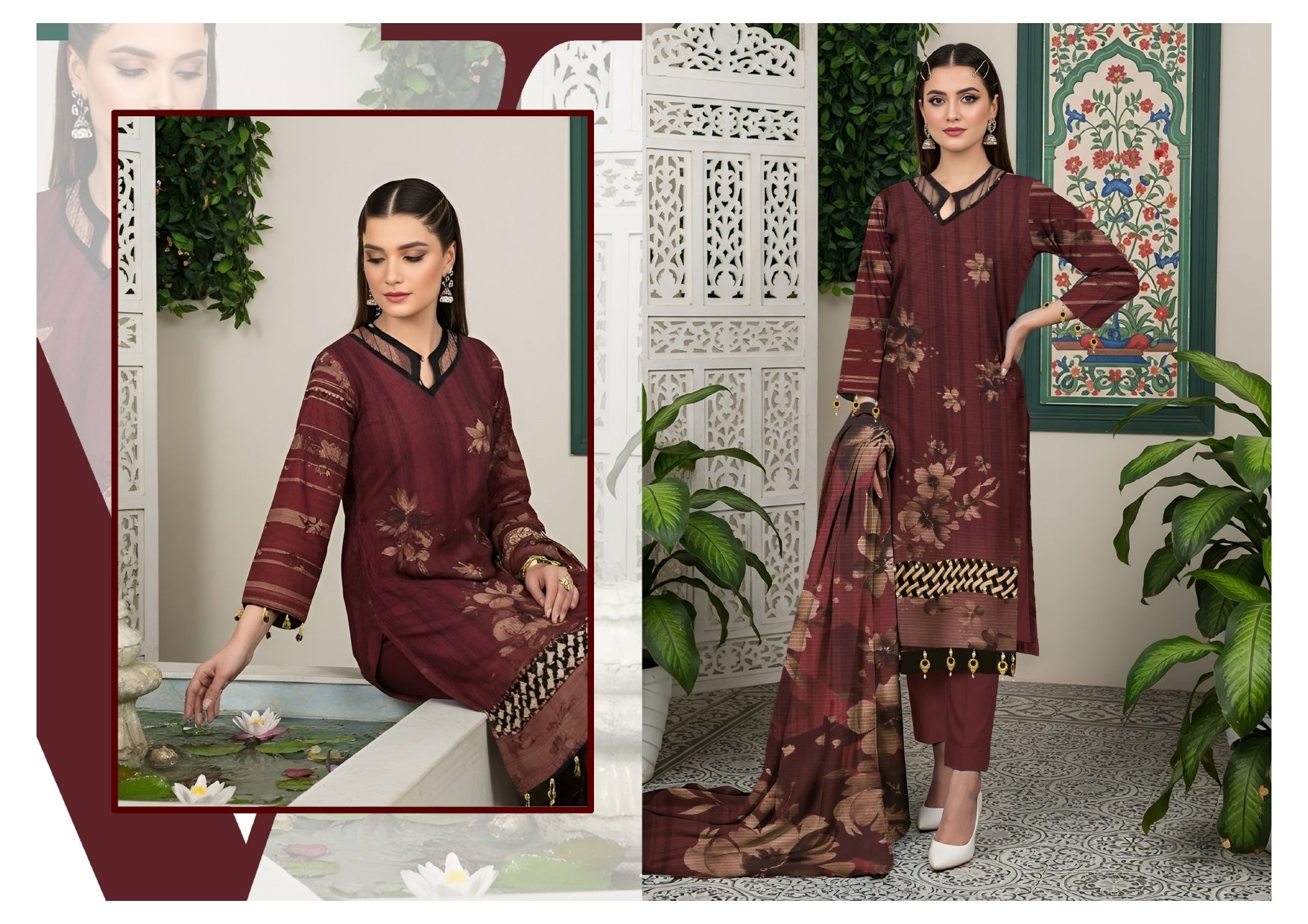 ✨ Step into timeless elegance with our second design from the Banadora Collection – the Digital Print Dhanak 3PC Suit (SKU: DHBD=2). This stunning ensemble features a rich maroon dhanak shirt adorned with beige and brown floral digital prints that evoke warmth and sophistication. The neckline and sleeves are beautifully detailed with black and gold accents, adding a touch of regal charm. The hemline is finished with delicate hanging embellishments that sway gracefully with every step. Paired with a dyed maroon trouser and a coordinating printed dhanak dupatta, this outfit is perfect for winter gatherings, festive occasions, or casual chic outings. The soft dhanak fabric ensures comfort while the vibrant design makes a bold style statement. Whether you're dressing up for a family dinner or a seasonal celebration, this 3PC suit promises effortless grace and standout appeal.